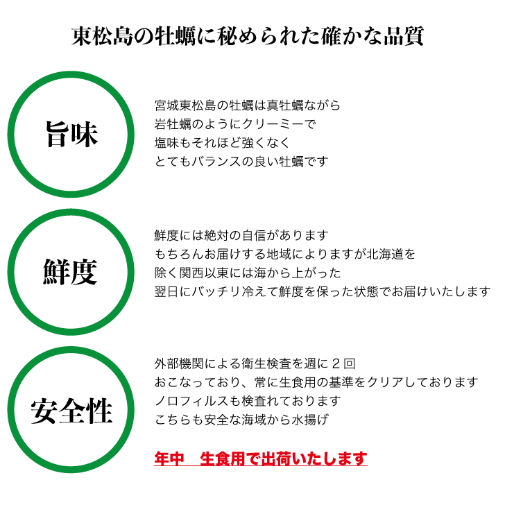 商品情報 名称 殻付き牡蠣賞味期限 発送日より4日内容量 3kgお召し上がり方 生食、加熱共に可 保存方法 冷蔵産地 宮城県東松島この商品は 牡蠣 訳あり 送料無料 宮城産 殻付き牡蠣 3kg 生食 ポイント 訳あり/無選別/送料無料/殻付き牡蠣/かき/3kg/30個前後 殻付き 安全な牡蠣をお届けする取り組み 当社では安心安全な牡蠣をご提供するために県や漁協の行う海域検査に加え定期的に自主検査を行い安全性を確保しています。