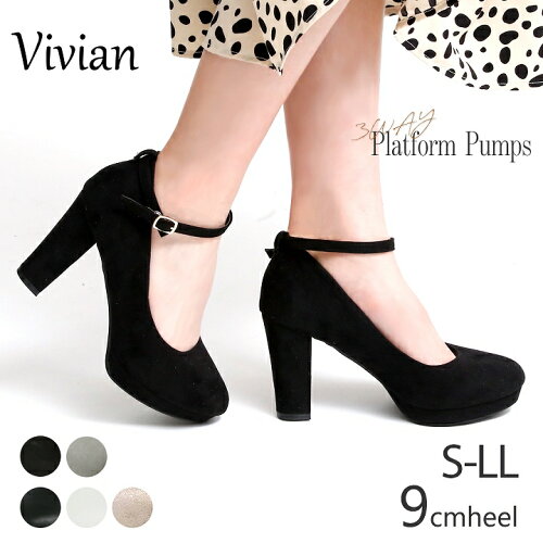 【インソールプレゼント対象】Vivian パンプス 痛くない プラットフォーム チャンキーヒール ラウンドトゥ ストラップ 9cmヒール 歩きやすい 大きいサイズ 小さいサイズ スエード ブラック 黒 アイボリー グレー ベージュ